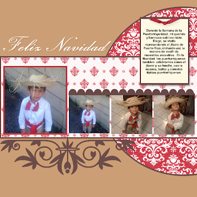 Hello friends! It's been a while since my last post to my blog. I have been through a lot of activity and stress lately but I am back to what I like the most! I wanted to share with you a Scrapbook page I did using MDS. I am also sharing some of my culture here. This last week,my little grand-nephew Diego had to represent in his school how our puertorican ancestor, the "Jibaro" dressed for the special occasions. He looked so charming in his costume! Christmas in Puerto Rico, specially in the inner parts of the island, is often celebrated like the "Jibaro" and his family used to celebrate it, with the same dances, songs and food. Christmas in Puerto Rico is a very lively season and a long one too. We begin just after Thanksgiving and end it with the Three Kings Day in January 6th. I love Christmas and I am already feeling it in the air!! Remember to tune in for our next Holiday Hop on December 1st. We are bringing more Season's inspiration to all our friends. For now, here is the most handsome "jibarito" ever, Diego Jose Bodden.